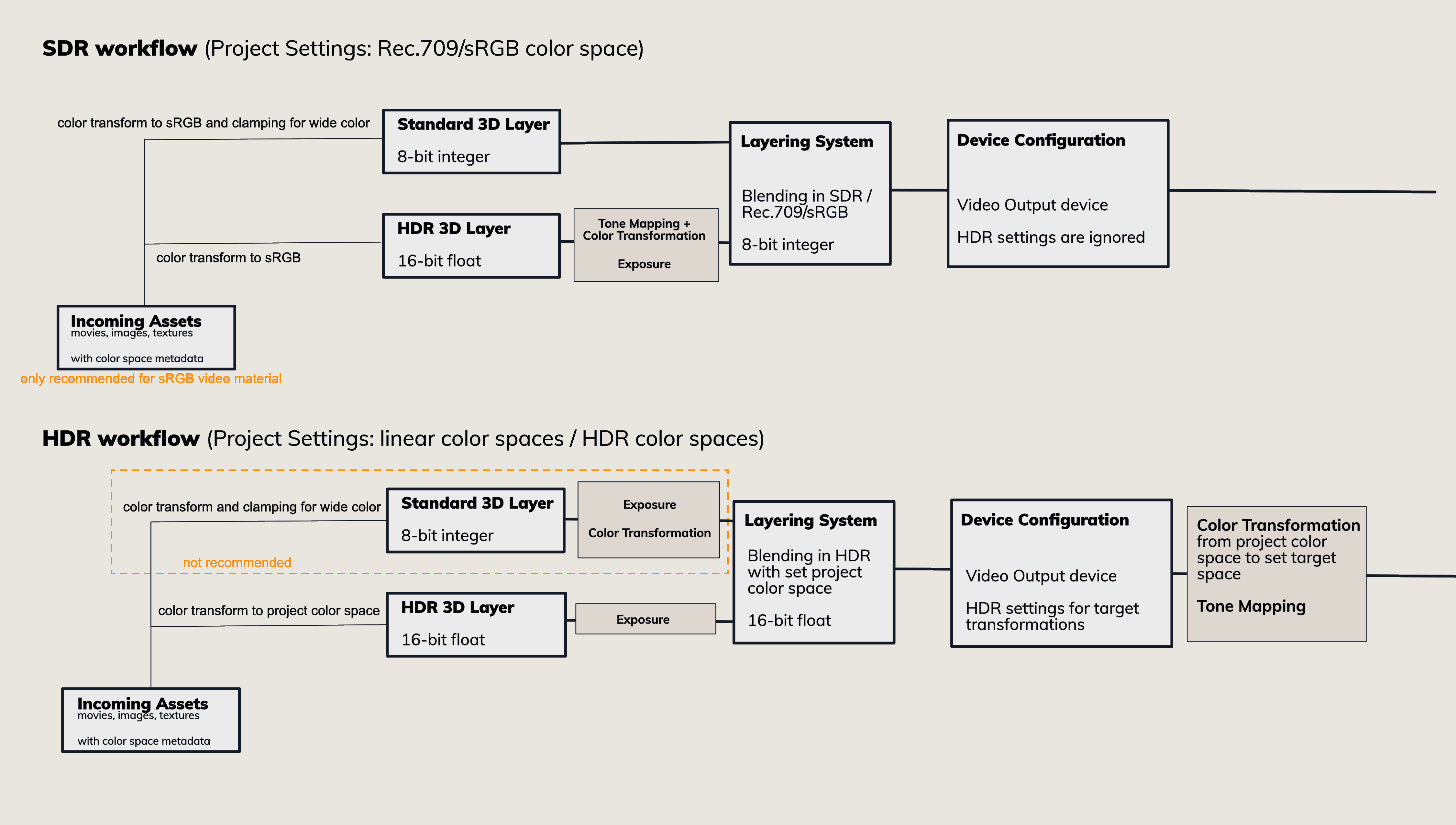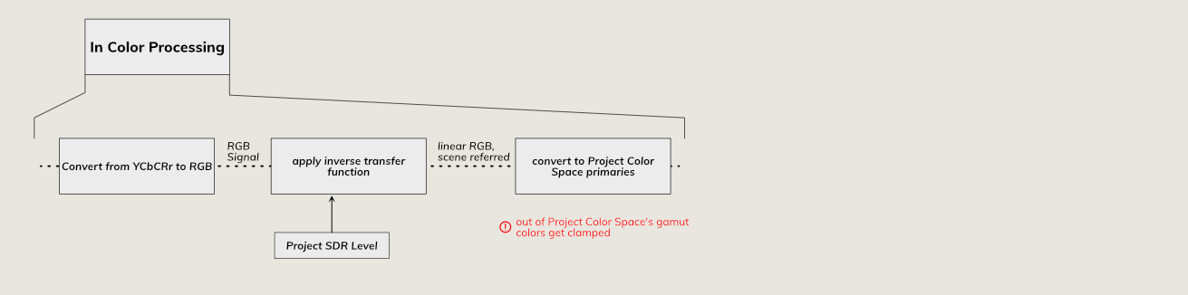 Also in the SDR workflow, all incoming assets, like movies, are color transformed as described for In Color Processing above.