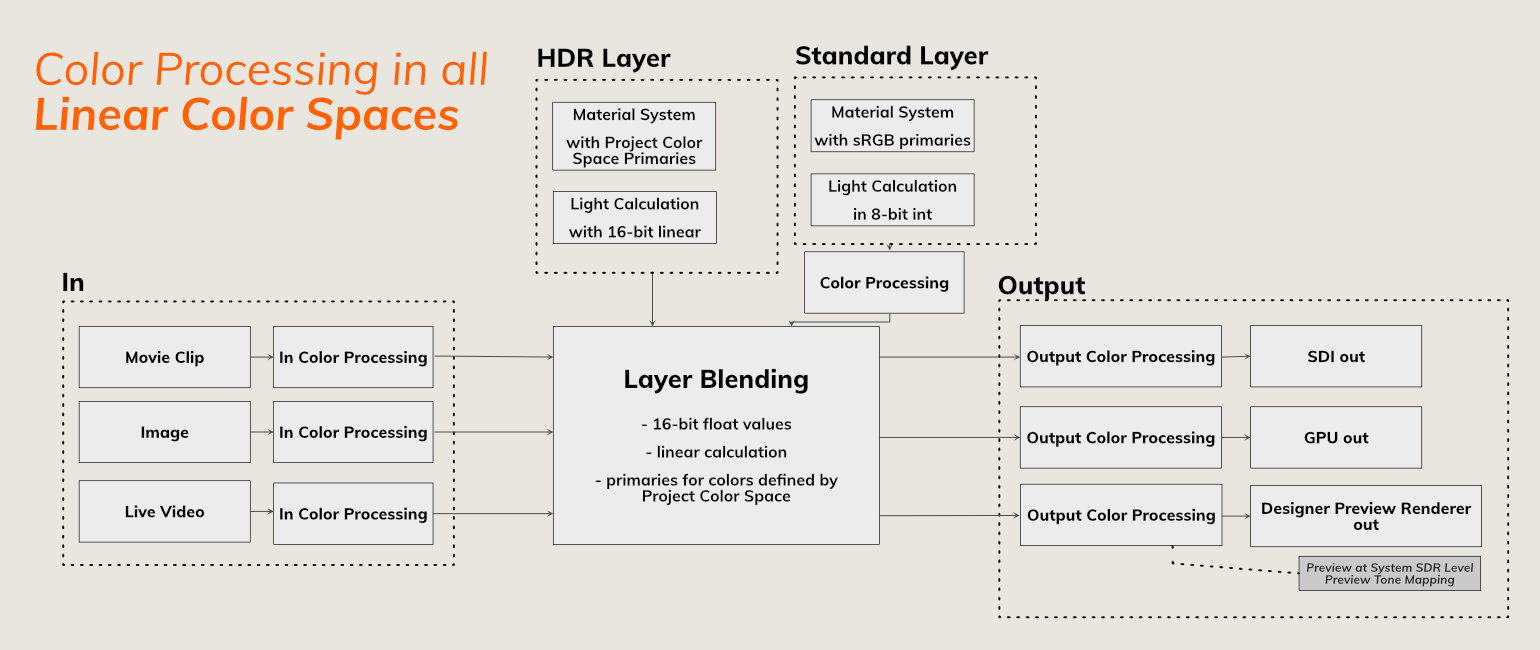 With every type of input, 3D rendering, and multiple outputs, a sophisticated color processing pipeline is necessary to handle all the different input and output color spaces and blend them correctly.