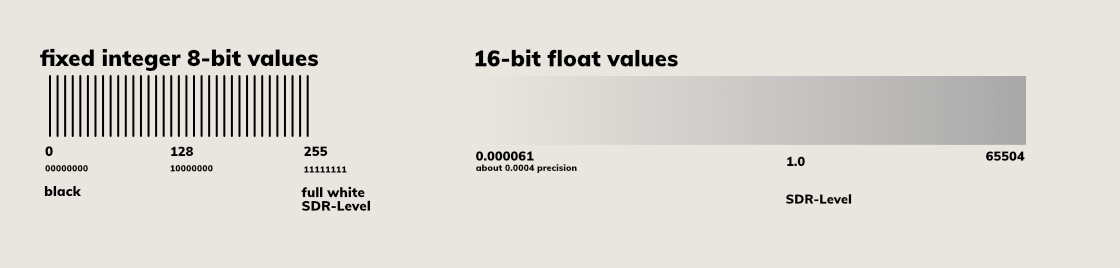 To support different color spaces and high dynamic range, it was necessary to extend the render calculation to 16-bit ​float values. The precision, step size, and the minimum and maximum values are no longer fixed. Therefore calculations outside the standard range of (0 to 1) are possible.