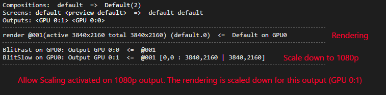 The following setup is a 3840px by 2160px screen as physical output on GPU0:0 (the first GPU output device in the device config) and a 1920px by 1080px screen on the GPU0:1 (the second output device). The screenshots show the Diagnostics of the Configuration Editor for the different cases of Allow Scaling enabled on the output configuration. The rendering is the simple default.vpr.