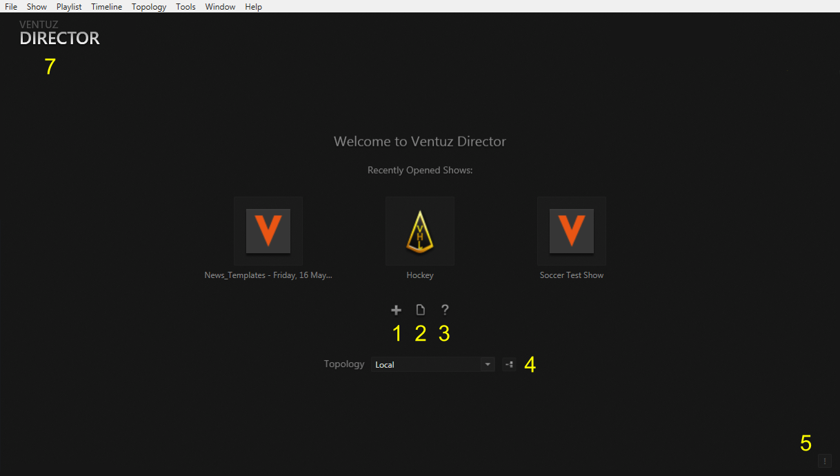 The center row of three icons represent the last three shows that have been opened which may or may not contain entries depending on - of course - if there have been opened shows before at all. The workspace also contains: