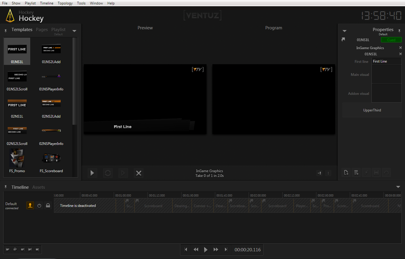The preview is rendered internally by the Runtime but notice that it does not appear in the on-air (= Program) window. To put the template on screen, click on the Take Button on the left of the Show Control (just beneath the lower left corner of the program output window), or press F1. Again, multiple things happen: