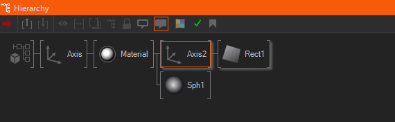 If a color is set at one node, it will be inherited by all its children. In the above example, only the Axis and the Material node have been explicitly assigned a color. Note that only Hierarchy nodes can be colored. The coloring is generally most effective when used sparingly to avoid a colorful chaos in the Hierarchy Editor.