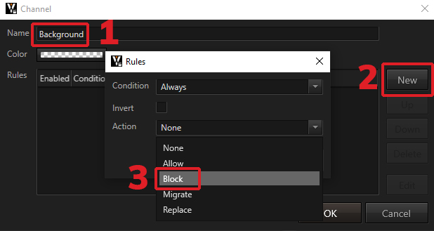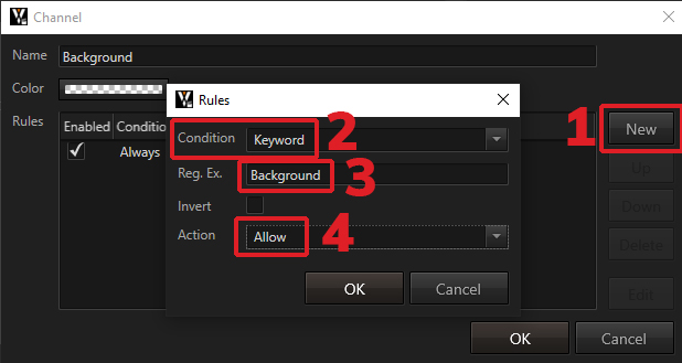 Now every Template with the Keyword "Background" in it will be allowed in this Channel. Repeat this steps for youre second Channel with the Keyword set to "Foreground", and you are all set to go live with your first multi Channel show. It is important to know that the order of the rules are important. Ventuz Director handles the rules from top to bottom. In our case, we first block all entries then we allow a specific keyword. The second rule is the exception of the first rule. If we would swapped the order of the rules, we would allow one keyword (which is allowed anyways, in the case of no rules) and the second rule would block all keywords.