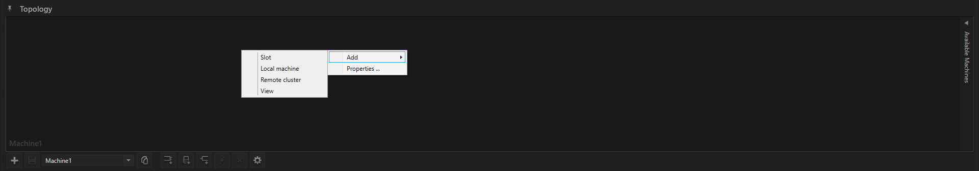 Now that you know what these elements are lets build a new Topology for our multi channel show. First click the small + in the bottom left corner to create a new Topology, so we dont work in the default local one. Give it a name and click ok. There are two ways to add the different elements we need. The first one would be the small menu bar in the bottom left.