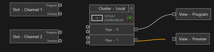 In order to connect those correctly we first need to connect the View elements to determine which Pipe will be handling the rendering of the Program and Preview. To connect an element with another click and hold on a Port and drag it over to the View element.