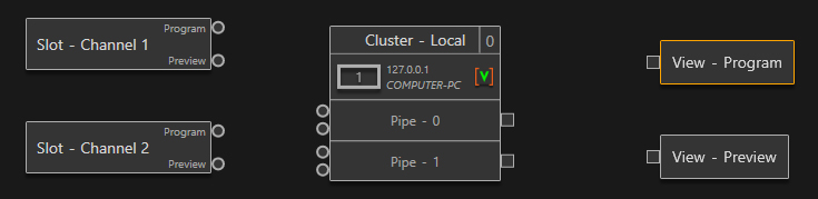 In order to connect those correctly we first need to connect the View elements to determine which Pipe will be handling the rendering of the Program and Preview. To connect an element with another  click and hold on a Port and drag it over to the View element.