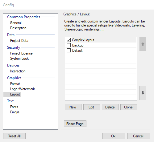 The configuration of Layouts is done in the Project Properties. The Layout section in the Project Properties dialog provides possibilities to create and edit Layouts.