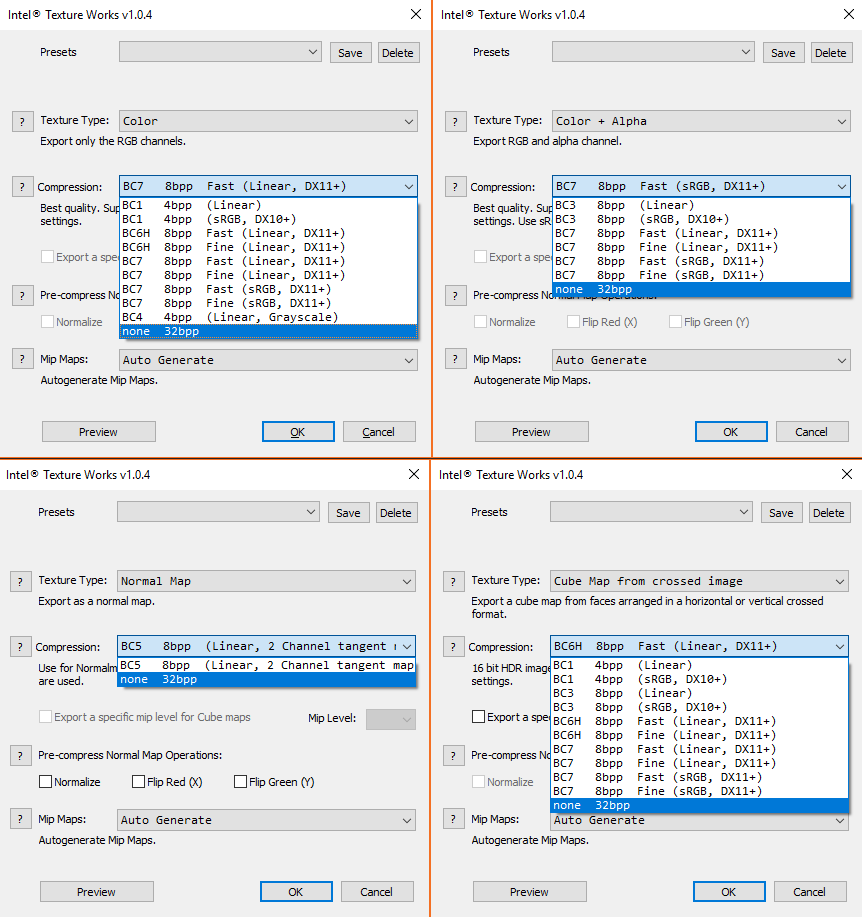 With the change and update to DirectX 11 for our graphics engine and the support of the latest BC modes we are able to use all currently available compression modes. Please see the following table for reference: