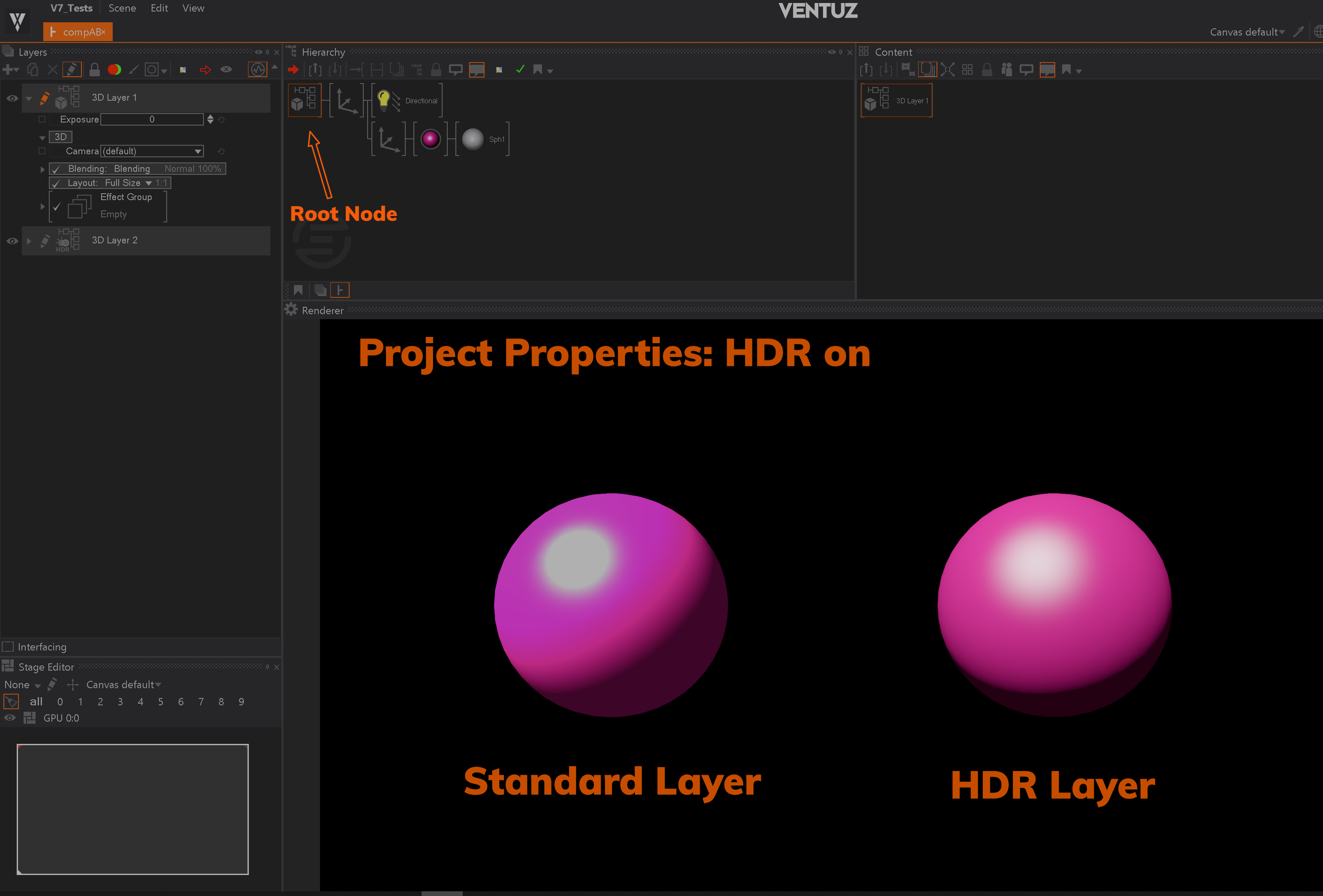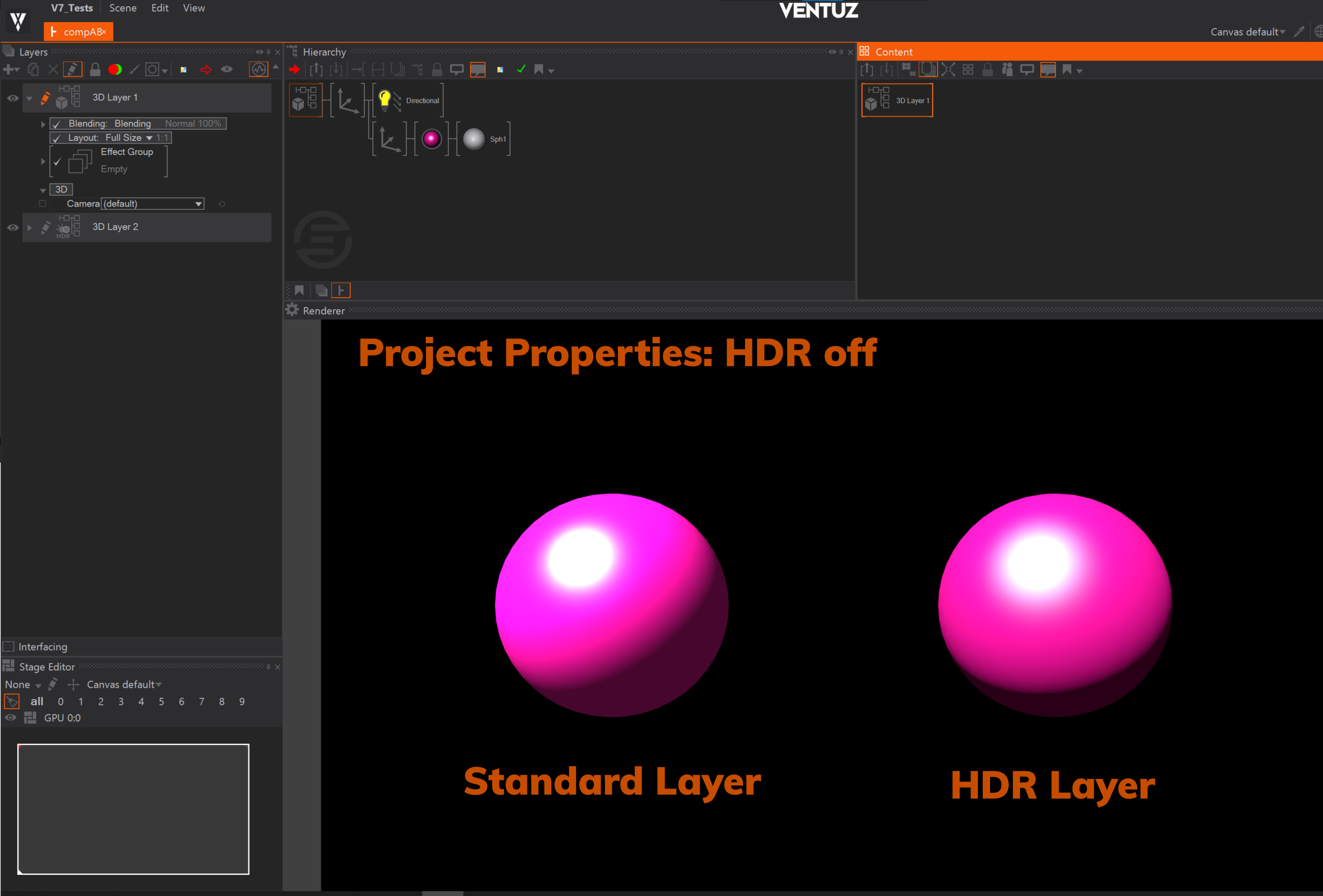You can see the difference between HDR and SDR where the Standard Layer rendering is only full white, with HDR there are still different shades of pink visible. Depending on your display Hardware and the set SDR white level, the HDR Layer should also pop out more, since the brightness is higher compared to the full white in SDR. You can enhance this effect by lowering the SDR white level in the Project Properties to 100 nits and increasing the Gain of your light sources.