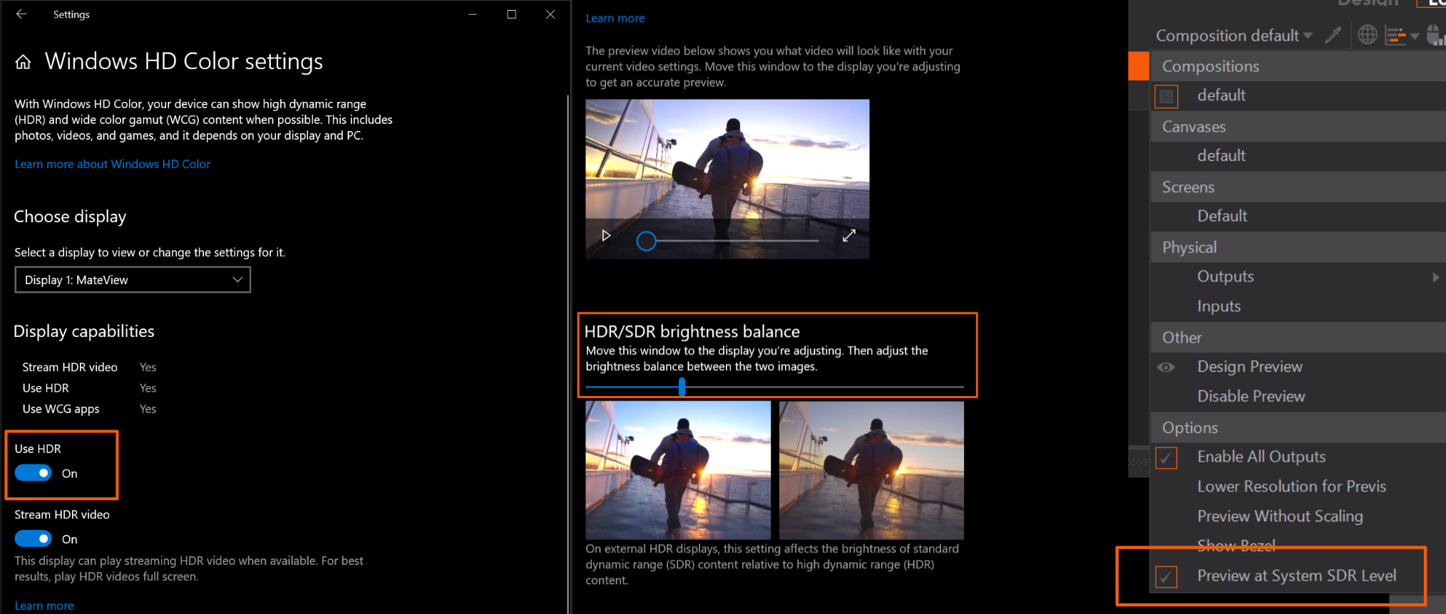 Preview at System SDR level: With the Preview Renderer Option for the SDR level, you can use the SDR white-level settings from the Windows display settings, instead from the Project Properties for the Preview Renderer.
