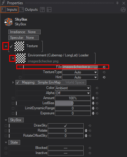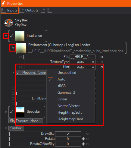 Most times the first step is to adjust the Gamma for the loaded images. Adjusting irradiance, specular and SkyTexture comes next. For each of these textures there is a dropdown property called Hint.