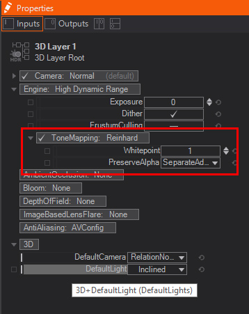 When the HDR Engine is enabled, you will see additional properties such as: Exposure, Dither, FrustumCulling and another dropdown menu for the ToneMapping selection as well as another set of properties depending on the selected ToneMapping mode.