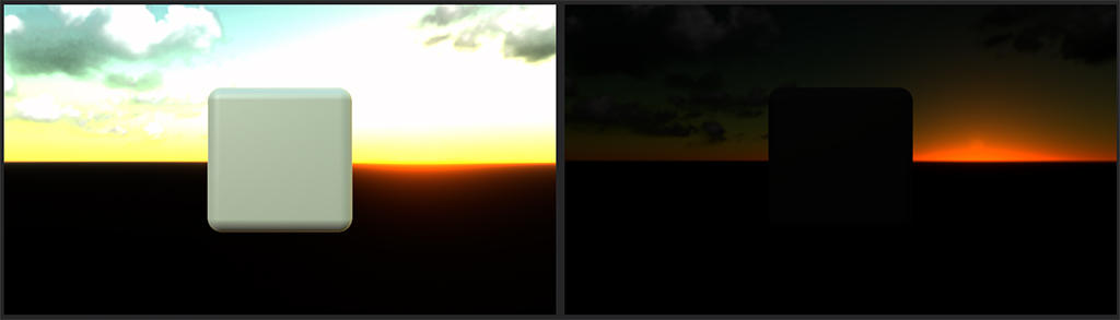 The above example shows the difference between an exposure value of -2.26(left) and -11.0(right) - This way you can realize how much dynamic light information is stored inside the HDRi. Also notice that the environment also lights and colorizes the geometry, the beveled cube in this case.