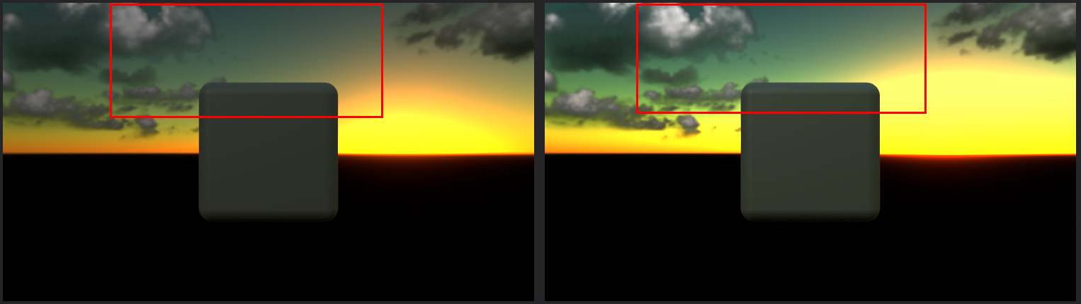 In the case of the HDRis from the Help Scenes, it would be wise to darken the scene, it still looks over-exposed (as long as you use our default textures). You will notice that starting with exposure values around -2.26, details such as clouds will be noticeable, and the cube will become more naturally lit. Adjust the 'Rotate: 70' for the SkyBox - this will rotate the whole sky and you should face the sun.