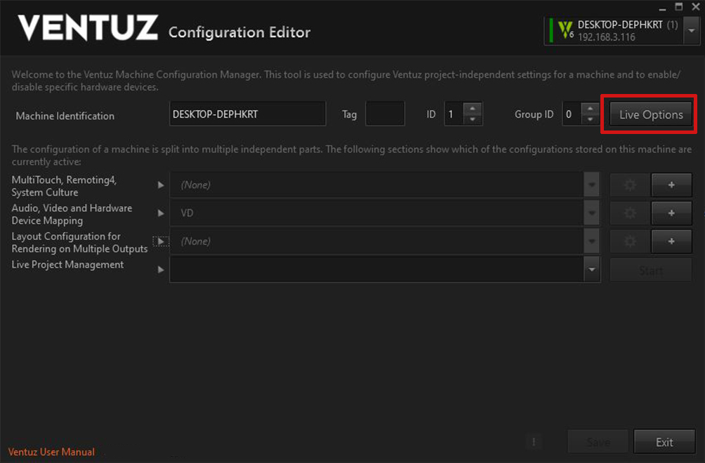While running a show in the Runtime, you can access the Live Options via the Live Options either by the Configuration Editor application or by the Web Browser. The Live Options button will be grayed out if no show or scene is running. When pressing it you will be greeted with many options that can be turned on and off, for a detailed description of these options have a look here.
