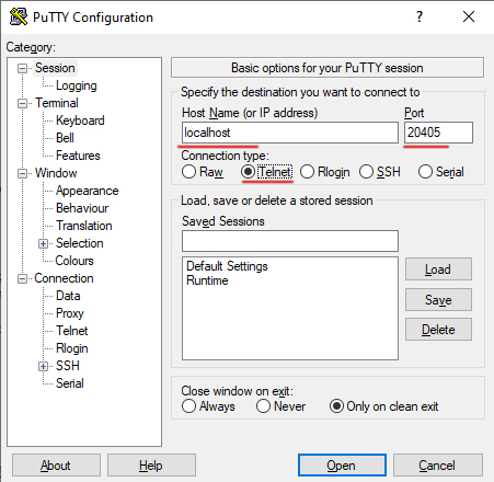 Here is the PuTTY client window. Make sure you selected Telnet as connection type.