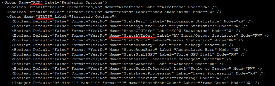 Here you can find a list of all available commands. But for now we are concentrating on the OPT command which holds the live options. If you just type in OPT you will see a list of all available command groups and there name. The group we are looking for is called REN which lists all rendering commands. There you will find another group inside which is called Stats.