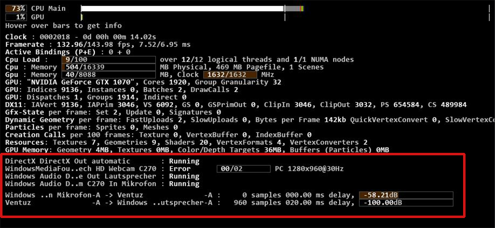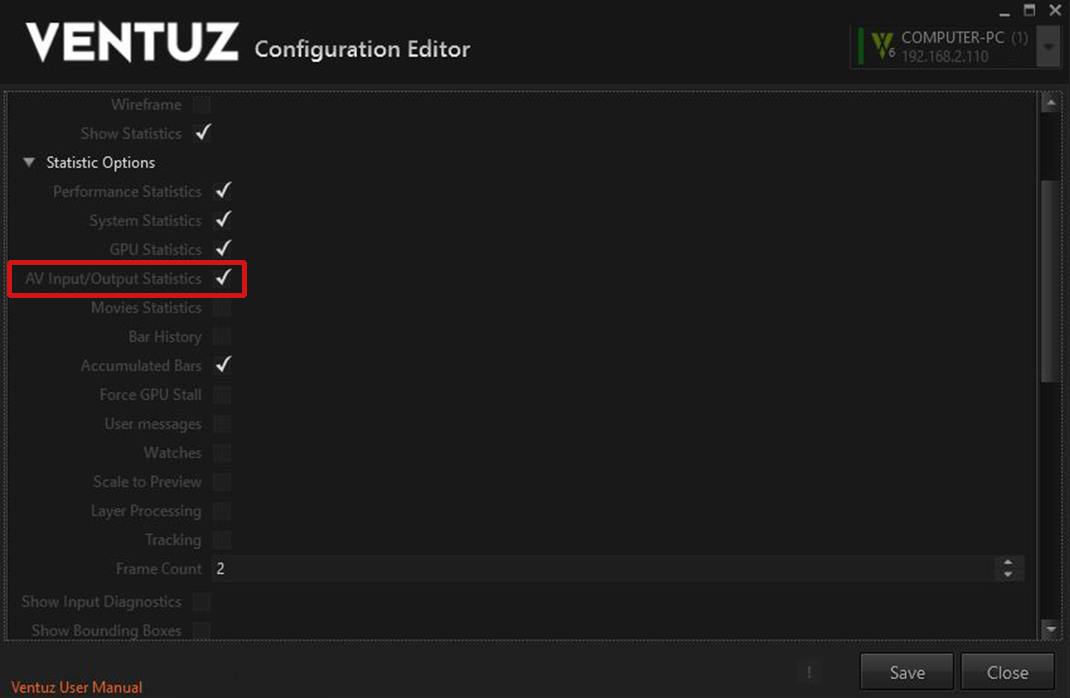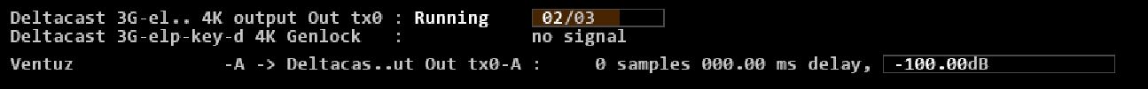 In the Performance Statistics section of the Live Options further up the list, you can find the Show Statistics and AVInput/Output Statistics flags. By activating both you get a overview of the connected devices and its status on the output of your running presentation.
