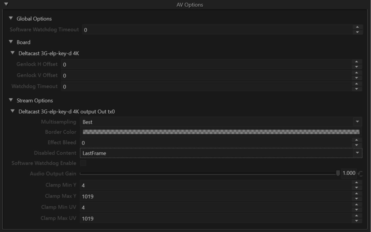 Further down you will find similar options to the standard GPU options. Like Multisampling, Effect bleed, border color and disabled content. For a more detailed description of these options take a look right here. The Clamp Options can only be found on Video signals using YUV that can be clamped to a certain range. Values are always specified in the 0 to 1023 range of 10 bit. if the stream uses an 8 bit YUV buffer, values are internally converted to 8 bit. If the stream uses an RGB buffer, this option is not available.