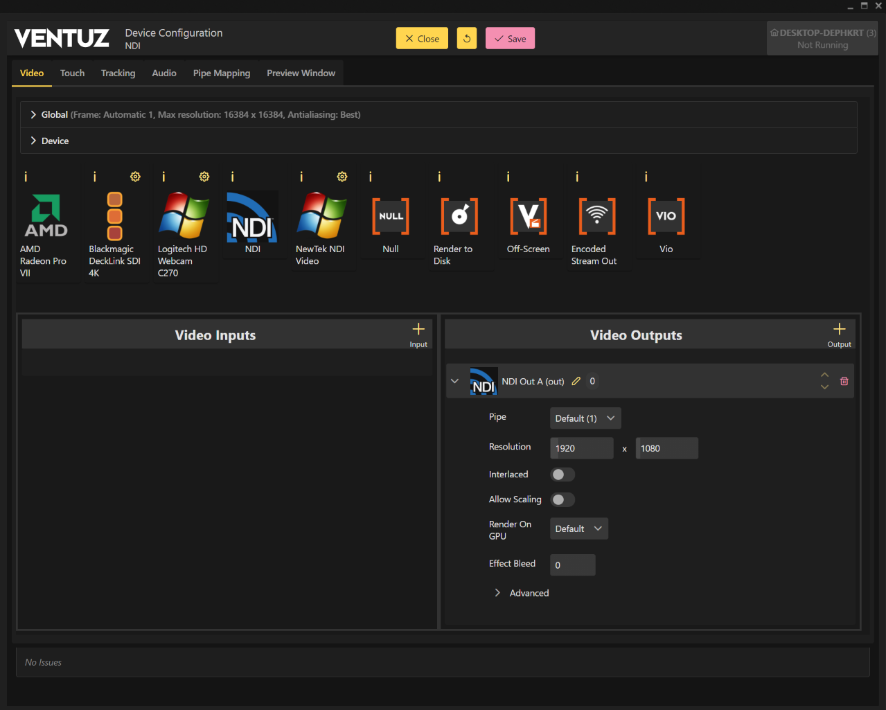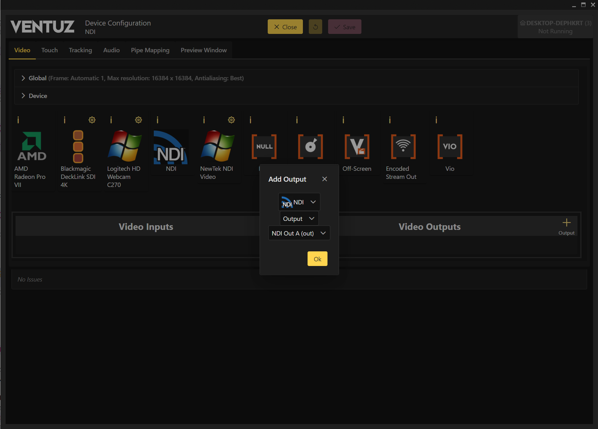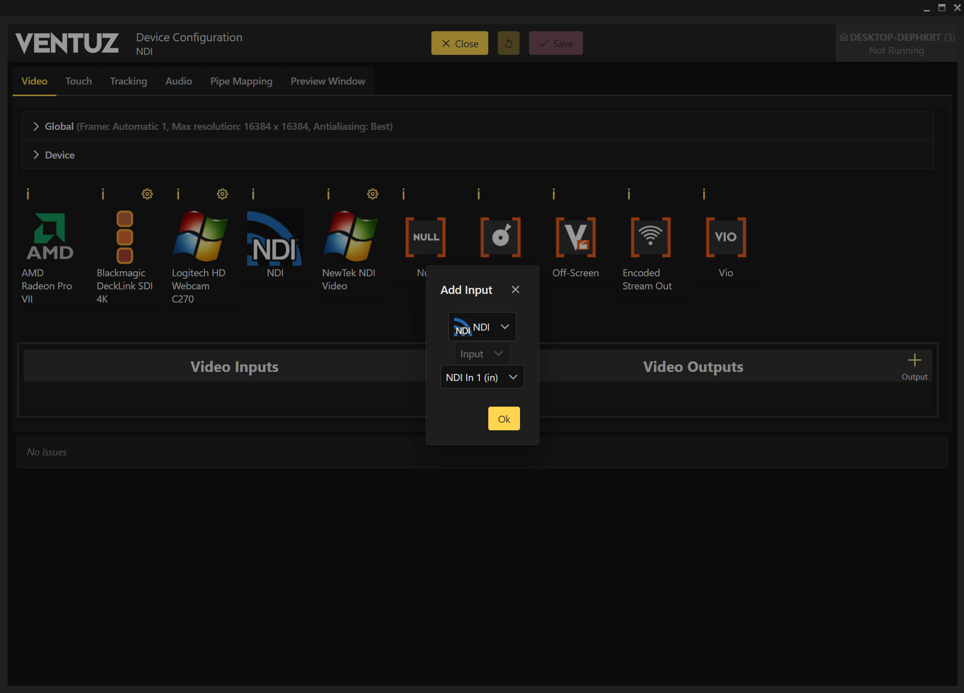 NDI is a network device interface that can be used to send or receive video streams over the network. You can use NDI Streams as an INPUT or create an OUTPUT and broadcast the output via NDI. You can install the NDI Tools use the NDI Scan Converter and select a window, screen, program as a Stream Source and use that stream in Ventuz. Or, you can use Ventuz and stream your content directly via NDI and access or view the Ventuz content stream on any machine that has an NDI Video Monitor.