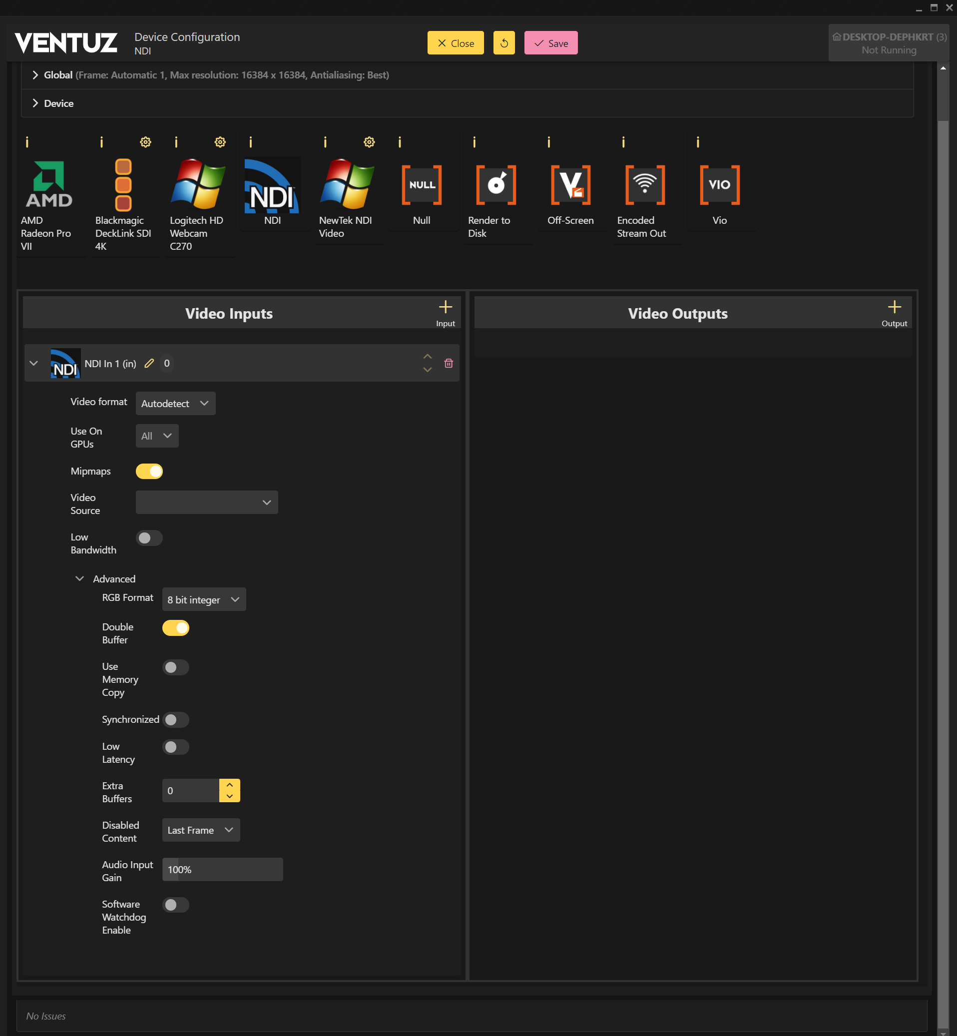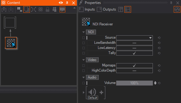You can make use of NDI by using the Ventuz Designer and the available NDI Nodes. You have the NDI Receiver, NDI Receiver Layer and the NDI Source List nodes available.