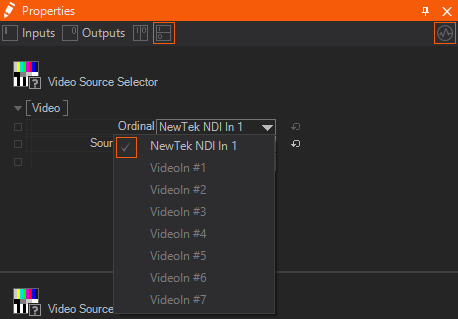 You can use the Video Source Selector node to select and/or switch between the different NDI inputs.  Click on the ordinal and select your NewTek NDI In here.