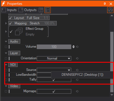 The NDI Properties can be found by  clicking on the 2D Layer - NDI Receiver Layer. You can select a NDI Source from there if one is available, by click  the Source drop down menu and select an appropriate item from the list. As for all NDI related sources, you can activate the LowBandwidth property to save bandwidth on the network.