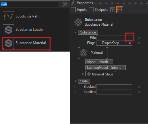 The Substance Material node works similar to the Material node, but it will create Material Stages and Lighting Options based on the loaded Substance. Thus you do not need to care much about the exact usage of the different textures. Though, in order to adjust the Substance Material's properties you will need to familiarize yourself with the Material node first.