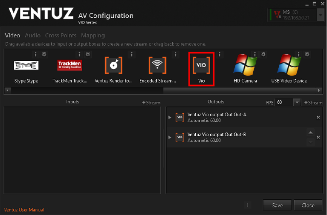 Ventuz has several options for outputting its rendered display. One of these options is Video in and Out, or VIO. This feature allows Ventuz to interface with other platforms.