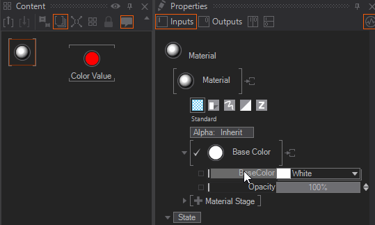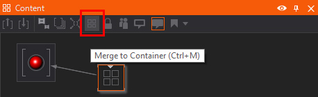 The Content Editor contains all of the logic of your scene and visualizes all the bindings between nodes. You will at all times see all Hierarchy Nodes that you currently selected in the Hierarchy Editor as well as all Content Nodes that are connected to exactly these nodes. Additionally you see all Content Nodes that are not connected to any Hierarchy Node.