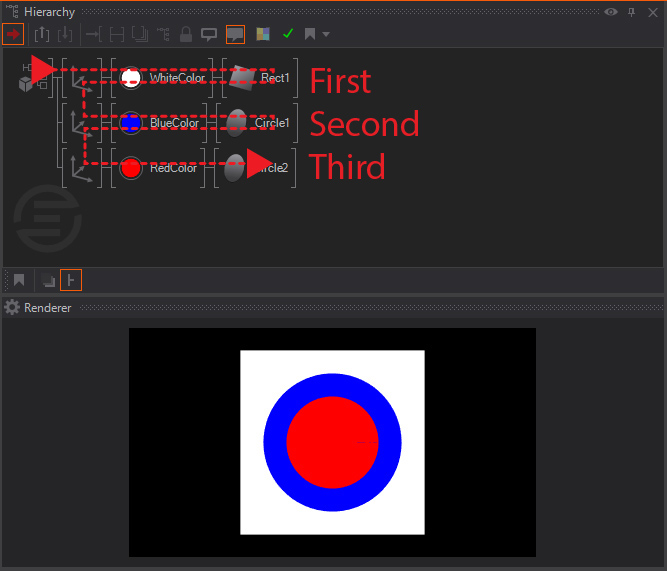 The way the hierarchy is shown also reflects the rendering order of the engine. Generally speaking the engine is processing the nodes the way they are sorted in the hierarchy. It processes node by node from top left to bottom right.
