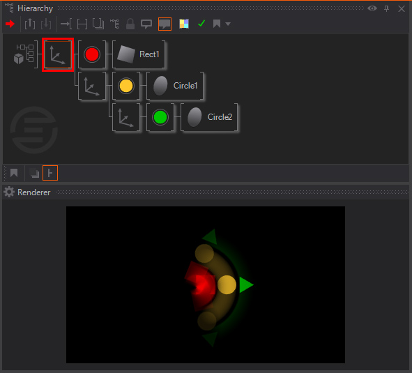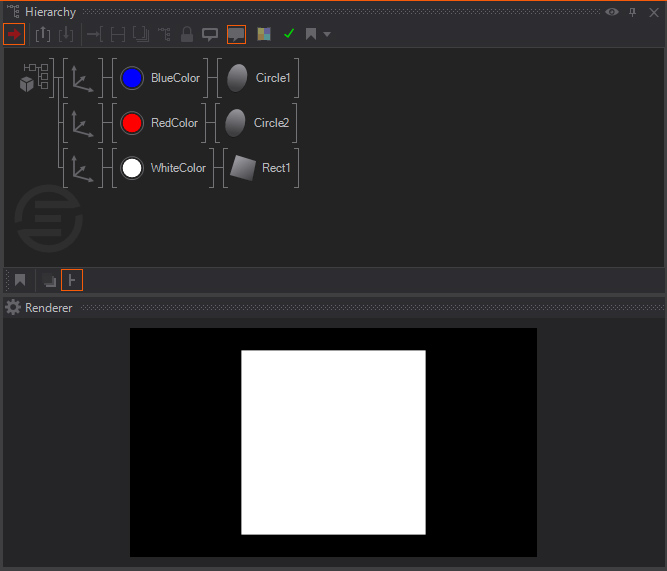 The Hierarchy Editor reflects, as the name says, the hierarchy of a 3D Layer. A 3D Layer will be rendered to a 2D Texture and then blended with all other Layers . This editor contains mostly the nodes which are used to visualize or position content in the renderer window - these nodes directly affect the behavior of the rendering engine of Ventuz in some way or another.