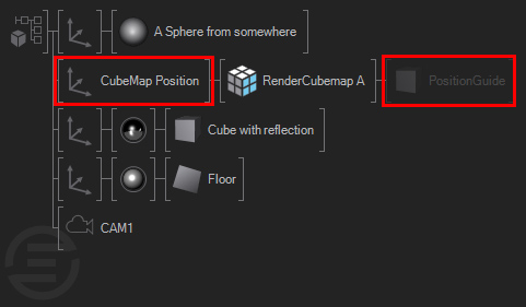 Whenever you plan to use the Cube Map Texture Property Output only, you do not need to have geometry sorted directly behind the Cube Map node. This gives you more freedom to bind the reflection where- and whenever you want. For an easier workflow you can still put a cube behind the RenderCubeMap Node to help you identify where the Cube Map reflection is rendered, i.d. the source/origin position of the reflection. Just add an Axis in front of the RenderCubeMap Node and reposition the "node" or better source position. As soon as you found the desired position you can block the geometry to hide your guide.