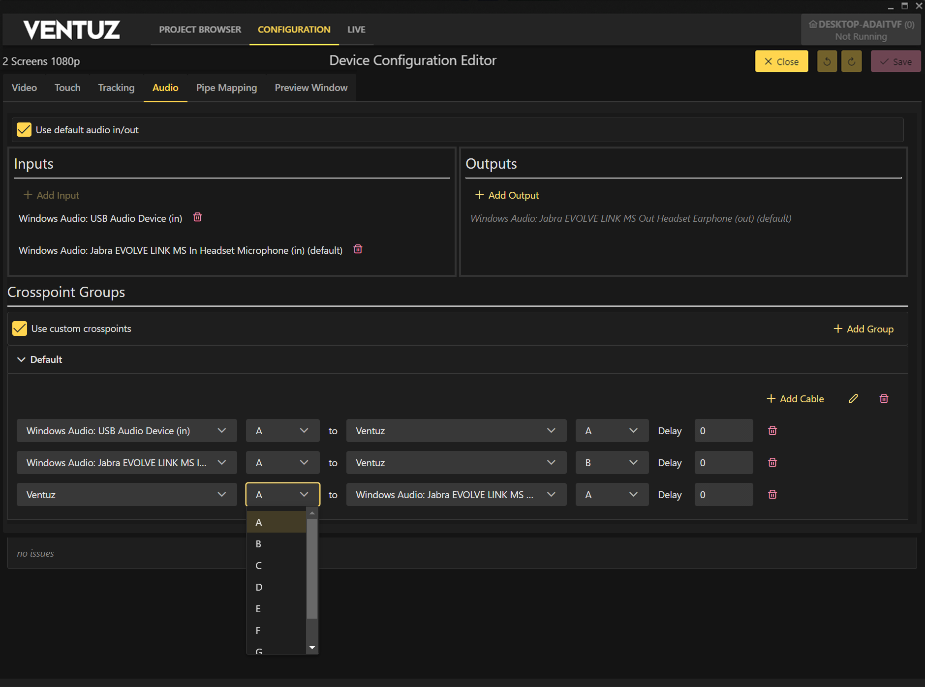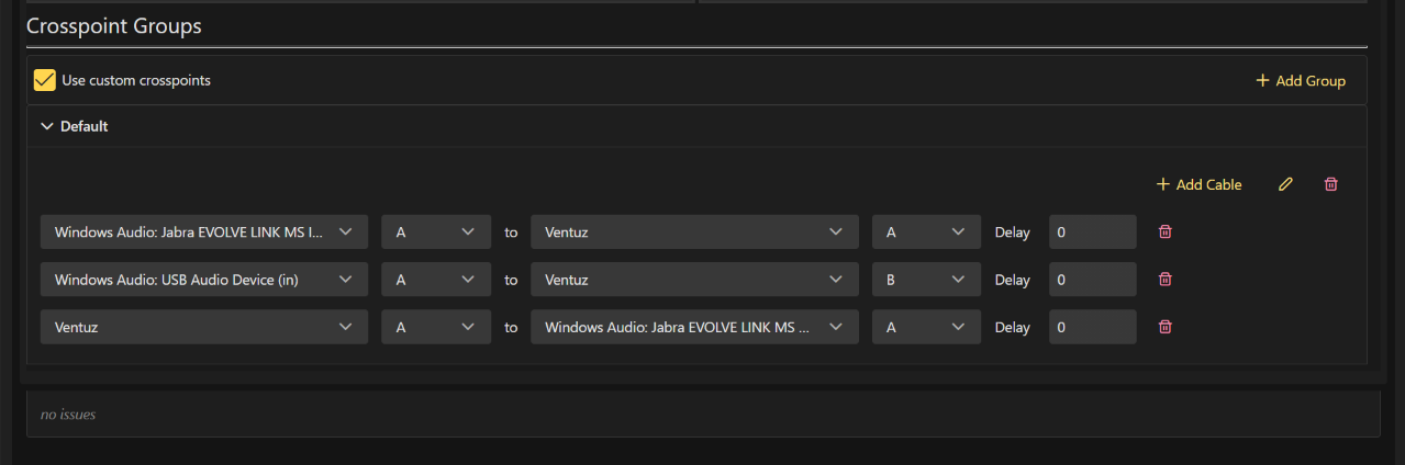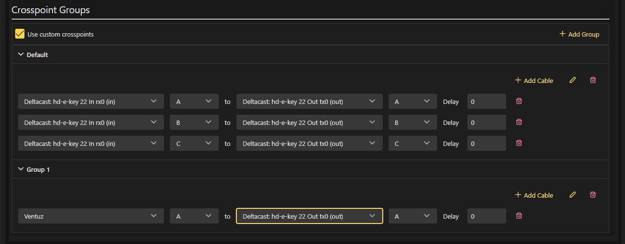 By default, the Use Custom Crosspoints checkbox is unchecked. In this mode, Ventuz automatically connects the first stereo pair of all configured audio and video streams to the Ventuz Record Pairs and routes all available audio outputs from all audio and video streams to the Ventuz Playback Pairs. All automatic connections are grouped into a single cable group called Default.