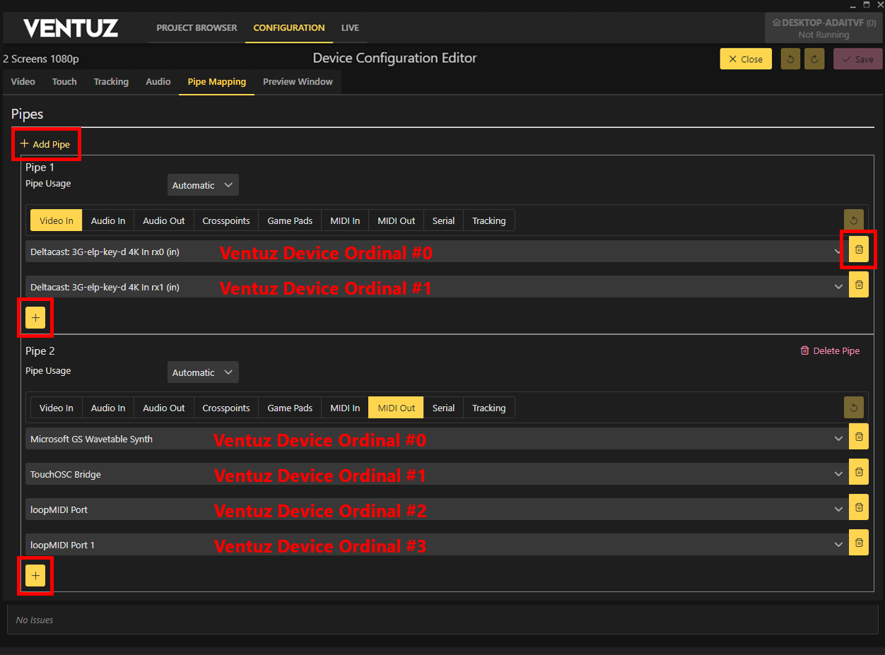 Since Ventuz 7, it is possible to configure multiple tracking devices, each controlling its own camera within Ventuz. In the Pipe Mapping section, the internal Device Ordinal for tracking can be adjusted. By default, the first device in the list is assigned Ordinal 0, with subsequent devices assigned incrementally (Ordinal 1, Ordinal 2, etc.).