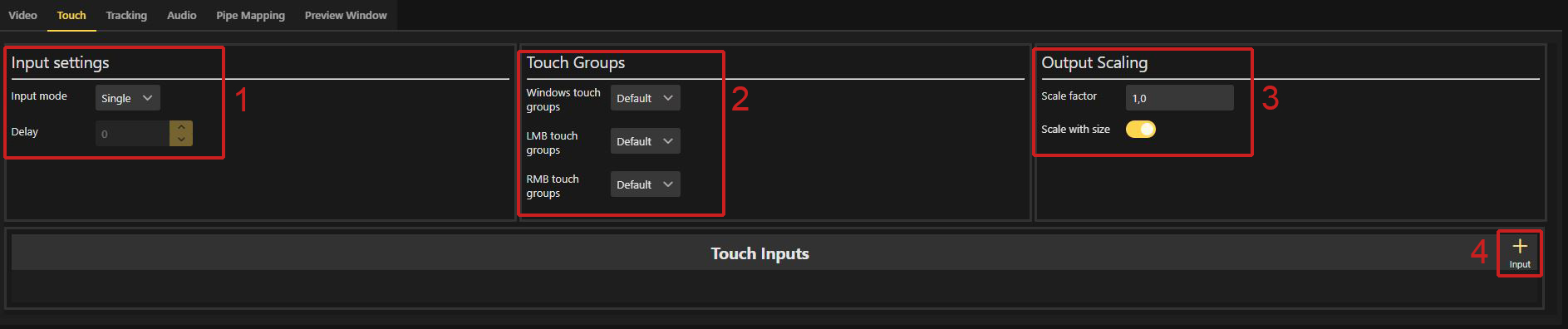 This section provides options to configure Touch Inputs. Input modes for clustering can be defined, specific Touch Groups can be enabled, and the handling of output scaling can be adjusted.