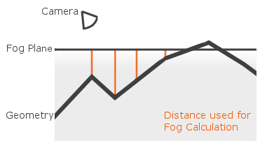 The Ground Fog basically works the same as the normal fog but extends it by one functionality: It will calculate the distance to either the camera position or a defined plane in space, whatever comes first. This way you can create a look of fog that stops at a certain height. The image below illustrates this:
