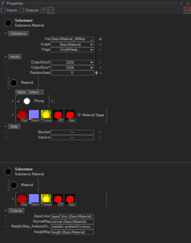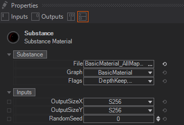 The Output Properties also vary depending on the loaded Substance. Usally you will find textures here which are already bound to the Material Stages - Texture Properties. In most cases the Outputs Texture Properties will give you a hint where to connect the texture to by reading a naming like BaseColor, NormalMap, Roughness and so on.