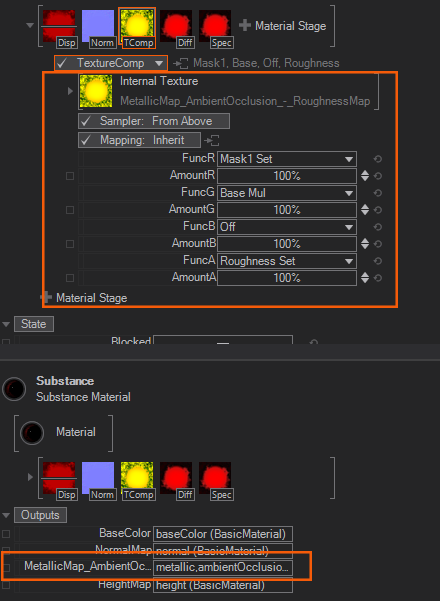 As soon as Ventuz did load a Substance and the Substance Engine has generated all the textures, the textures will be compacted. In the following example the Metallic-, Roughness- and AmbientOcclusionMap are "compacted" into one internal single Texture Stage since these textures contain greyscale informations anyway. You still have access to all single textures by using each single R,G,B or A channel.