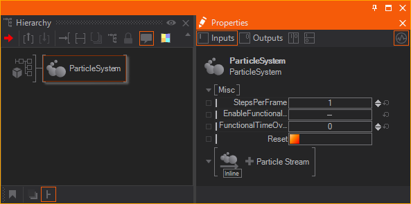 A Particle System must be placed in the scene's hierarchy by using the Particle System Node. It can consist of several Particle Streams. They can be placed either as Property Groups in the Particle System or as Content Nodes and bound to an Input of the Particle System Node.