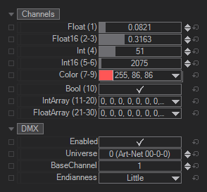• FloatArray (Float[]): An array of consecutive DMX channels of type Float. The length of the array is defined by the user when the property is added to the node.