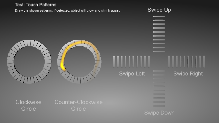The Touch Pattern node continuously listens to touch movements and tries to interpret the movement when the touch ends. For example, when the user swipes to the left, the node will fire a Swipe Left event, allowing the scene to browse through a collection of items or offer other navigational elements. There are currently only six hard-coded events, four swipes and two circle patterns. If a touch ends but it does not sufficiently match any of the patterns, the No Match event is fired.