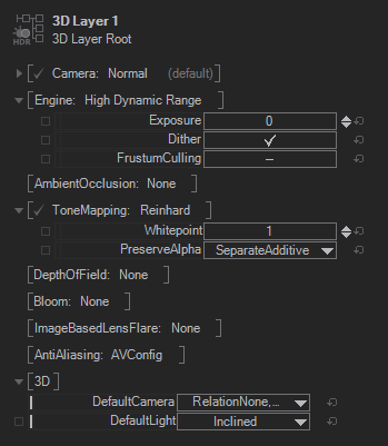 Unfold or Right Click the Engine property to show HDR specific properties. You can adjust the Exposure level then, to change the luminosity level. The Dither option reduces color banding. FrustumCulling works the same way as in the Standard Engine mode.