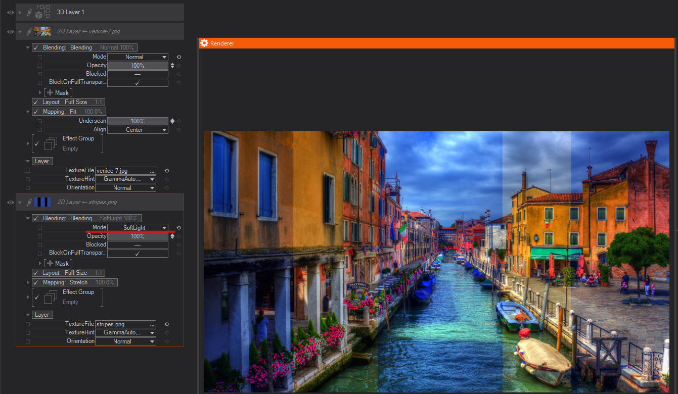 These Properties may vary for the different Layer-types. The most common Property is the Orientation Property which makes it possible to Rotate the Layer in any direction or Mirror and Flip it. There are several Layer-specific properties depending on the Layer Type. The Image Layer has Properties like the TextureFile and TextureHint which controls the Gamma and Alpha loading, while for example the Constant Color Layer has a TextureColor Property. As mentioned before, each Layer Type may vary in the Layer Properties.