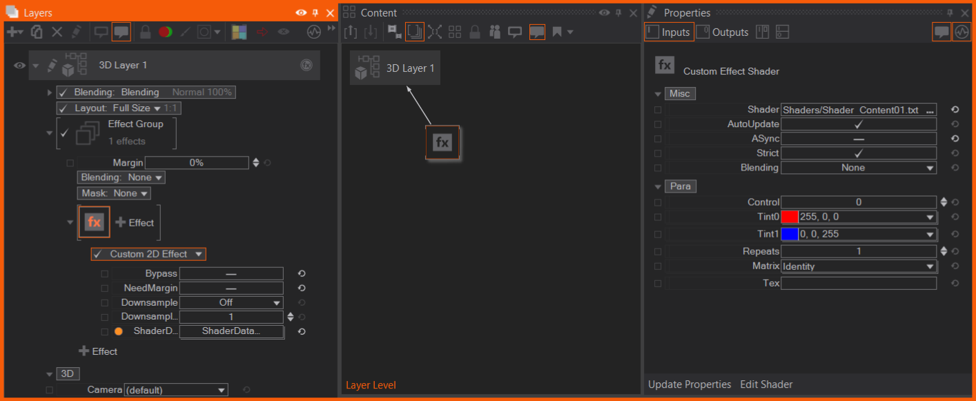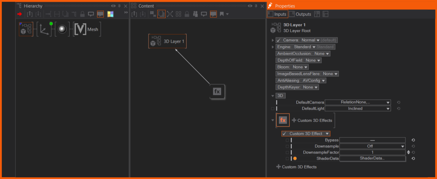 The Custom 3D Effect is placed on the 3D Layer's Root Node of a 3D Layer. It also needs to be bound to a Custom Effect Shader node. The 3D effect can access the camera information of the layer and the depth buffer, via Special Names. The properties of effect have the same functionality as the 2D effect.