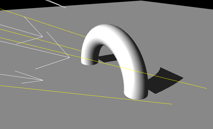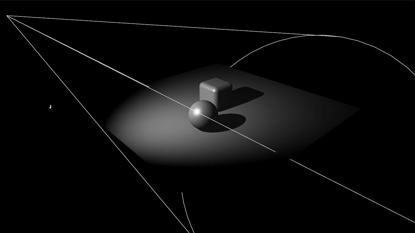 This will show the shadow volume by rendering infinte lines, which visualize the volume bounds. By using the Width, Height and Depth properties, you can adjust the volume's boundaries. Everything that is inside the volume will act as a shadow caster. It is therefore possible to have just a part of an object throw a shadow, as long as it is inside the volume. See the screenshot below: