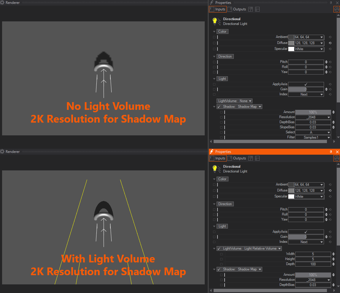 While the upper screen result is more of a blocky and pixelated shadow map, compared to the crisp and high resolution shadow map for the other, you can see, that without a defined LightVolume the whole scene (in this case the 400unit ground floor) is taken into account for the shadow map calculation. Therefore you have less pixels in the same shadow map available - since it has to cover the whole scene. If you define a LightVolume for the shadow map calculation you can define specific areas that really advance of a shadow map or are point of interest, while not wasting the space on the shadow map or resolution in other areas in the scene, which are out of focus or point of interest.