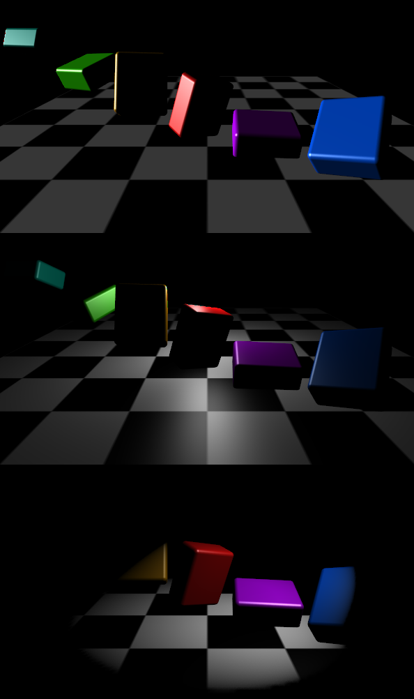 The example below shows the same scene lit by a Direction light coming hard from the left, a Point light above the scene and a Spot light coming from the right.