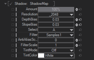 The Amount is the overall intensity of the shadows. Resolution is the shadowmap resolution and should be as small as possible. With the DepthBias and SlopeBias you adjust the sampling of the shadowmap (see How To Use Shadows for more details). You can define to have the shadows in a group by the Select drop down menu. You can set the Shadowmap in the A or B group or have it off any group. The grouping works together with the Shadow Filter. The Filter drop down menu affects the shadowmap filtering and you can select between Samples 1, Samples 4 and Samples 8. When Samples 4 or Samples 8 is selected you can also adjust the quality of the sampling by changing the AntiAliasScale and FilterScale. If the values for the Scales is 0 and not bound, the sampling scale is completely turned off in the shader and therefor the performance increases.